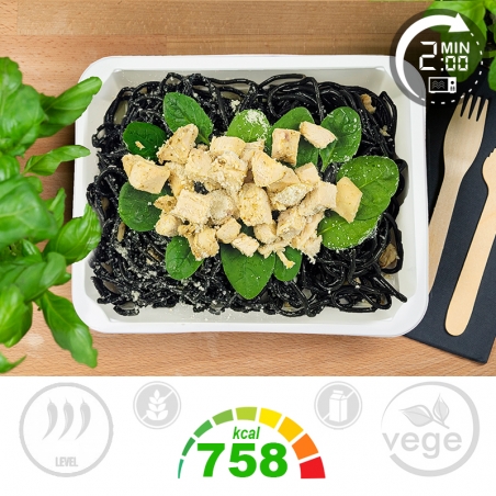 Składniki: Makaron tagliatelle 50,5% (makaron tagliatelle czarny [mąka z PSZENICY durum, sepia (atrament z MĄTWY, sól)] 99,9%, sól 0,1%), Kurczak w glazurze sojowo-miodowej 20,7% (pierś z kurczaka 91,7%, sos SOJOWY jasny (woda, ziarno SOI, sól, ocet spirytusowy) 2,8%, miód 1,5%, papryka wędzona mielona 1%, sok z cytryny 1%, olej rzepakowy 0,8%, sól 0,6%, czosnek 0,5%), Mix warzyw 18,4% (kalafior 35,9%, marchew 31,9%, brokuł 31,9%, sól 0,4%), Aglio olio 9,2% (oliwa z oliwek 78,5%, czosnek 14,9%, natka pietruszki 5%, papryka chili 1%, lubczyk 0,5%, pieprz czarny 0,1%, sól 0,1%), Ser dojrzewający twardy 1,1% (ser dojrzewający twardy tarty (MLEKO, sól, podpuszczka mikrobiologiczna, lizozym z JAJKA) 100%)